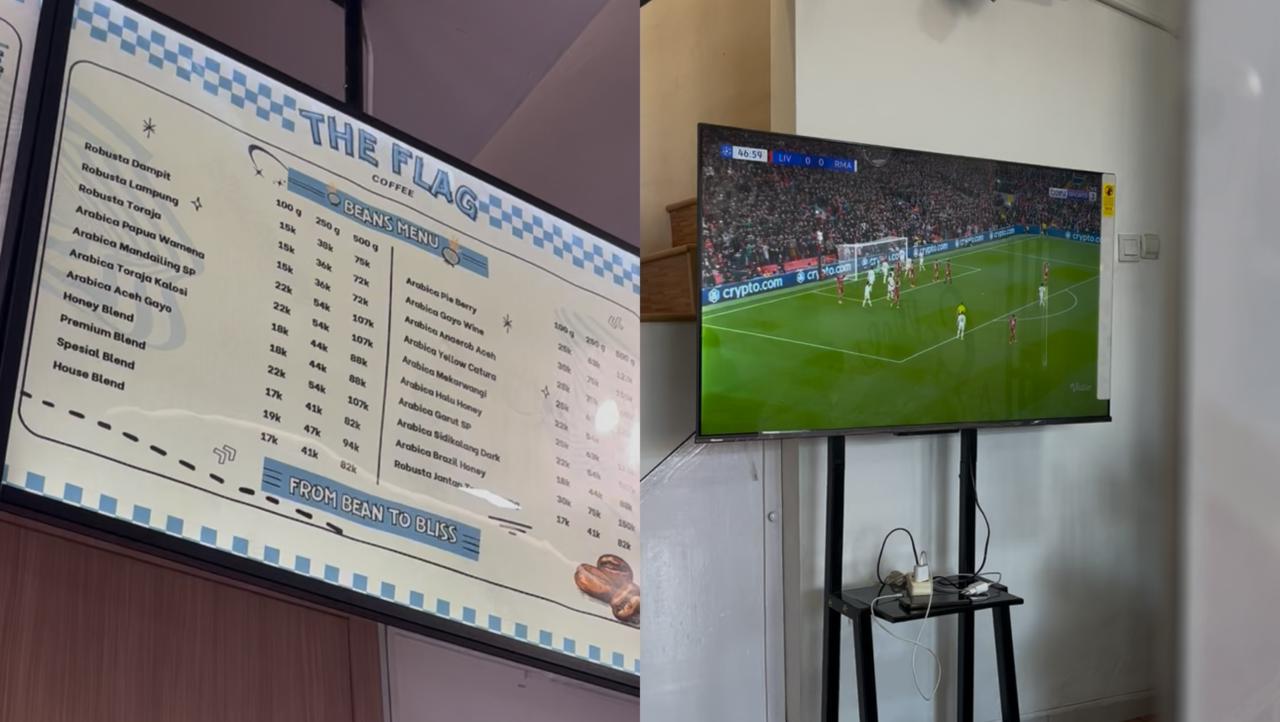 Selain untuk pemesanan, lantai bawah The Flag Coffee ini digunakan juga sebagai area dine in yang asik banget dipakai untuk ngopi bareng sampai nobar (nonton bareng) karena ada TV dengan layar besar yang memang dikhususkan untuk nobar pertandingan sepak bola.